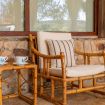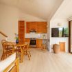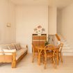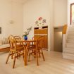 Il portico arredato, affacciato sul verde, è uno spazio perfetto per gustare una colazione, cenare all’aperto, rilassarsi al tramonto con un buon calice di vino. All’interno, l’atmosfera è calda e familiare: il soggiorno con divano e tavolo da pranzo dialoga con la luce esterna, mentre l’angolo cottura è attrezzato con tutto il necessario per sentirsi subito a casa. La camera matrimoniale al piano terra ha accesso diretto al giardino, permettendo di godere appieno della continuità tra gli spazi interni e l’ambiente naturale circostante.