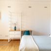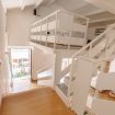 Si accede ai diversi livelli, su cui si sviluppa la casa, tramite una scala a giorno elegante e funzionale, con i gradini in legno e la balaustra in metallo chiaro che contribuisce a rendere l’ambiente giovanile e semplice allo stesso tempo.