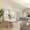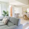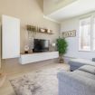 Gli interni riflettono un’eleganza discreta: un angolo cottura moderno completamente attrezzato, un’area living con divano e TV a schermo piatto, e una zona pranzo dove luce e materiali naturali creano un’atmosfera accogliente e autentica.